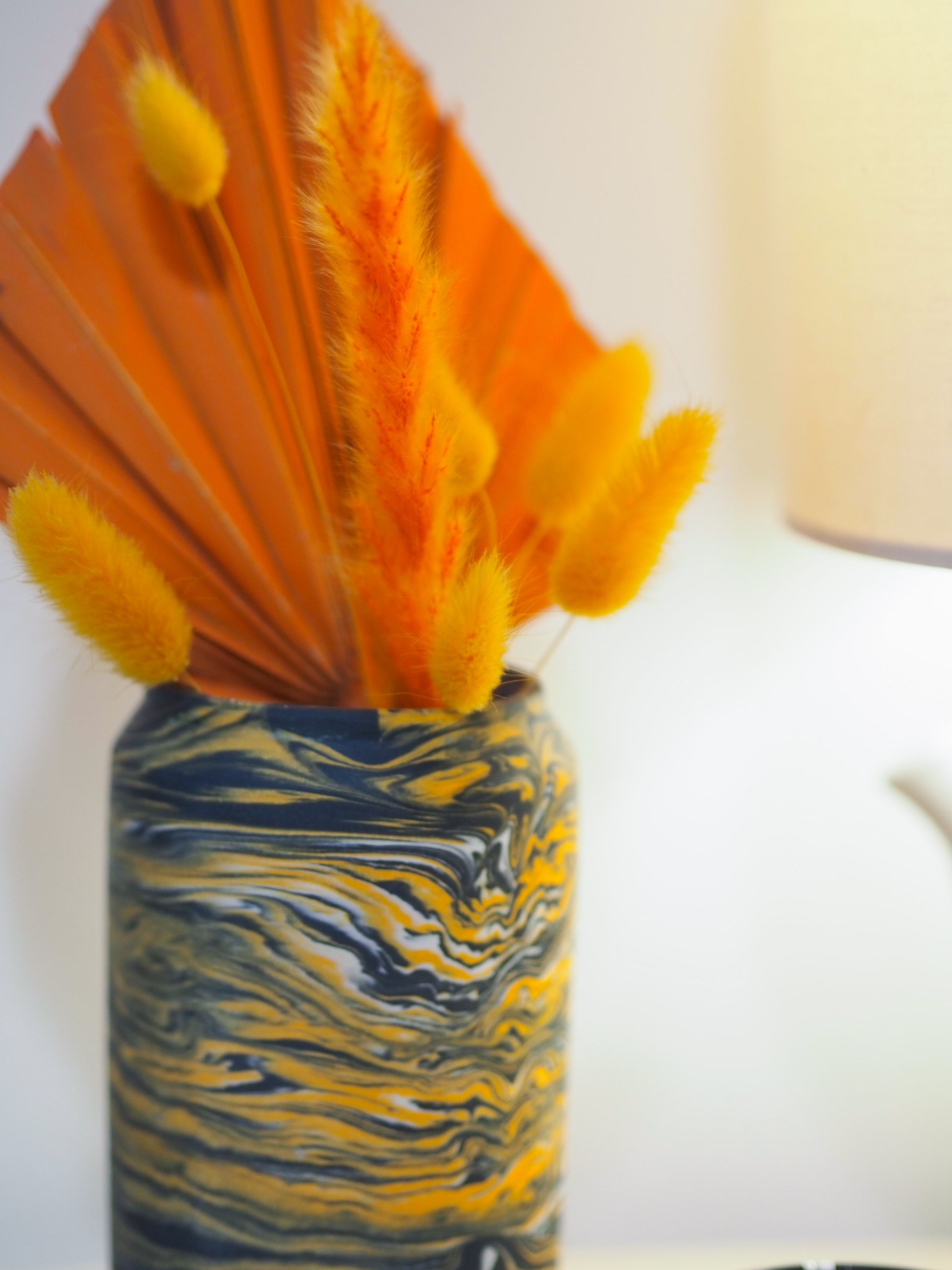 Add a pop of color to your space with our uniquely marbled Tall Vase. Made from vibrant and eco-friendly resin, this sustainable vase is the perfect statement piece for your home. (Flowers not included)